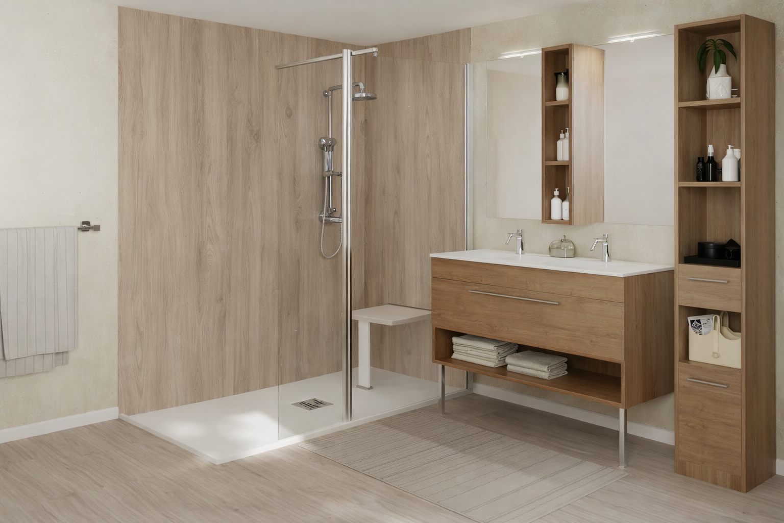 Accès de plain-pied pour une douche totalement accessible : siège rabattable, barre de maintien, sol antidérapant… adieu les risques de glissade ou de chute, vive l’aisance et la liberté de mouvement.